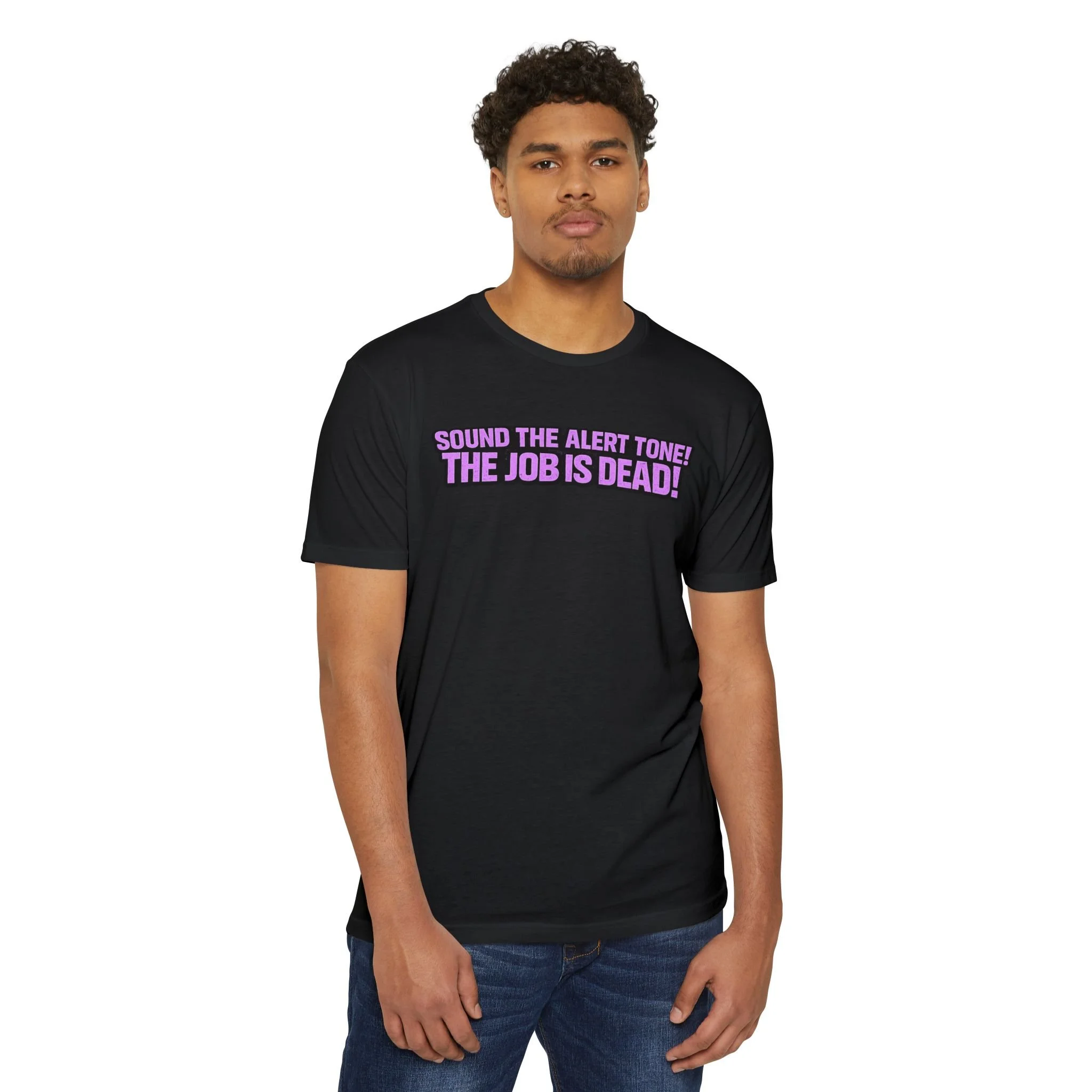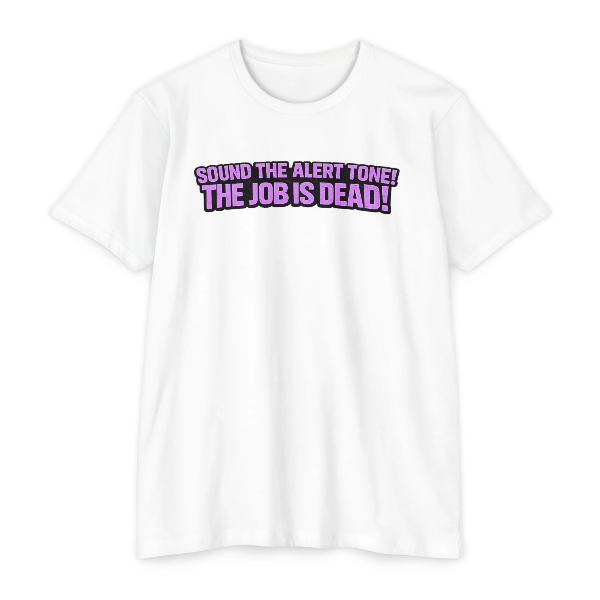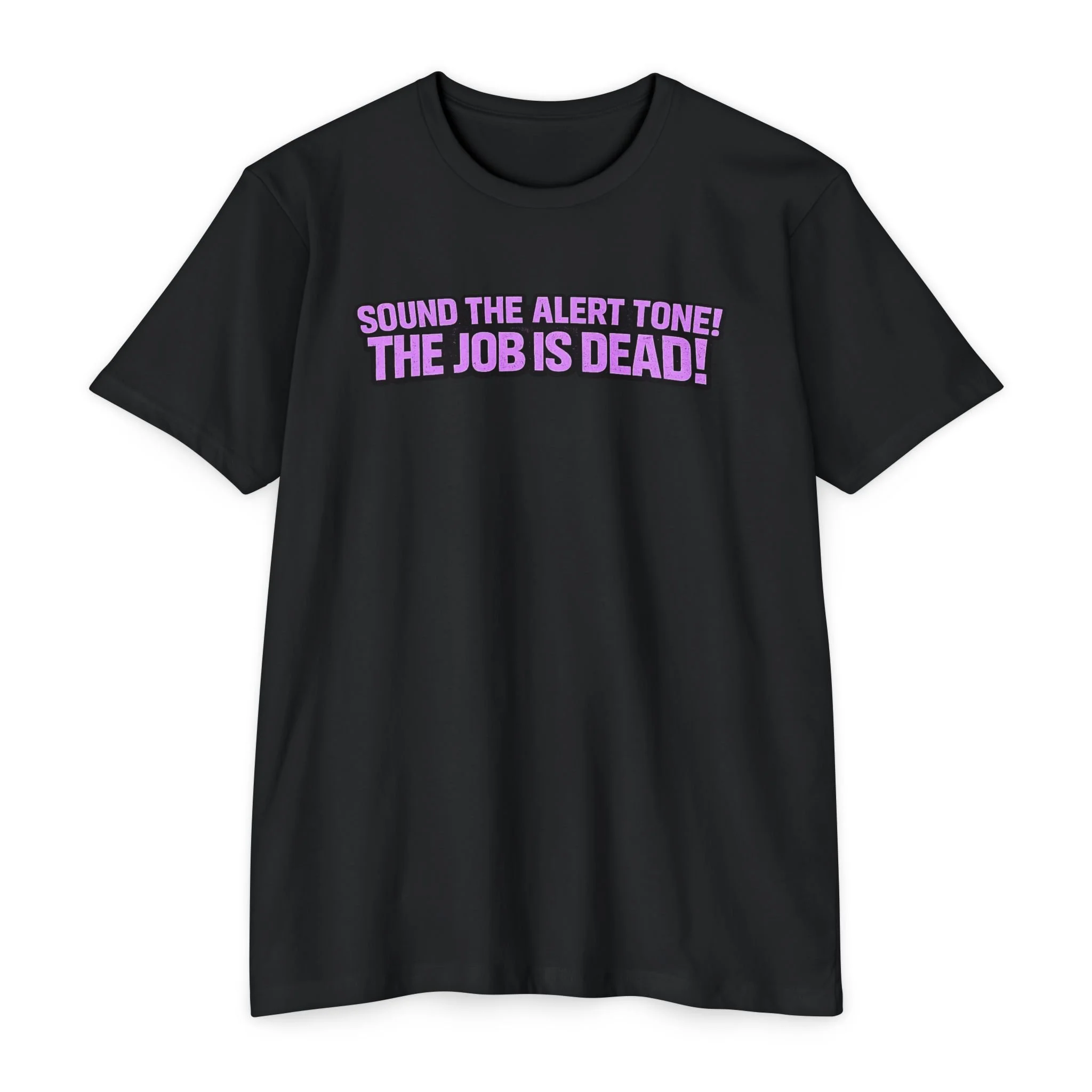 Lightweight and soft, this classic-fit tee carries a bold, conversational slogan—‘Sound the alert tone! The job is dead!’—printed in bright, punchy lettering that feels equal parts wry and triumphant. The fabric’s smooth hand and subtle drape make it easy to wear all day, whether you’re making a statement on a coffee run or layering it under a jacket for an evening out. The fit falls clean and familiar, letting the graphic take center stage while remaining comfortable for moving through a busy day. Wear it when you need a little humor-fueled catharsis or when you want to share a knowing wink with coworkers, friends, or fellow industry people who’ll get the joke.