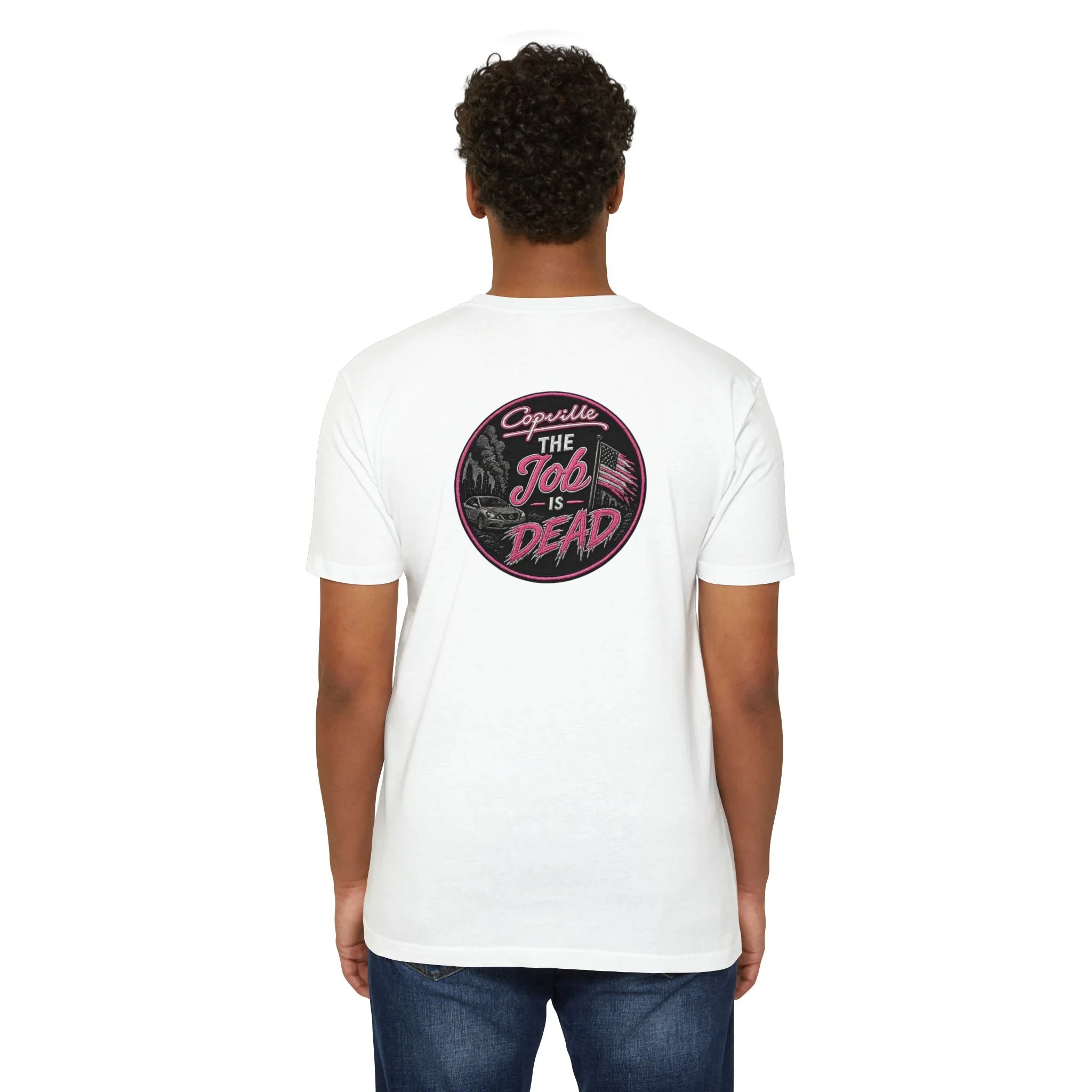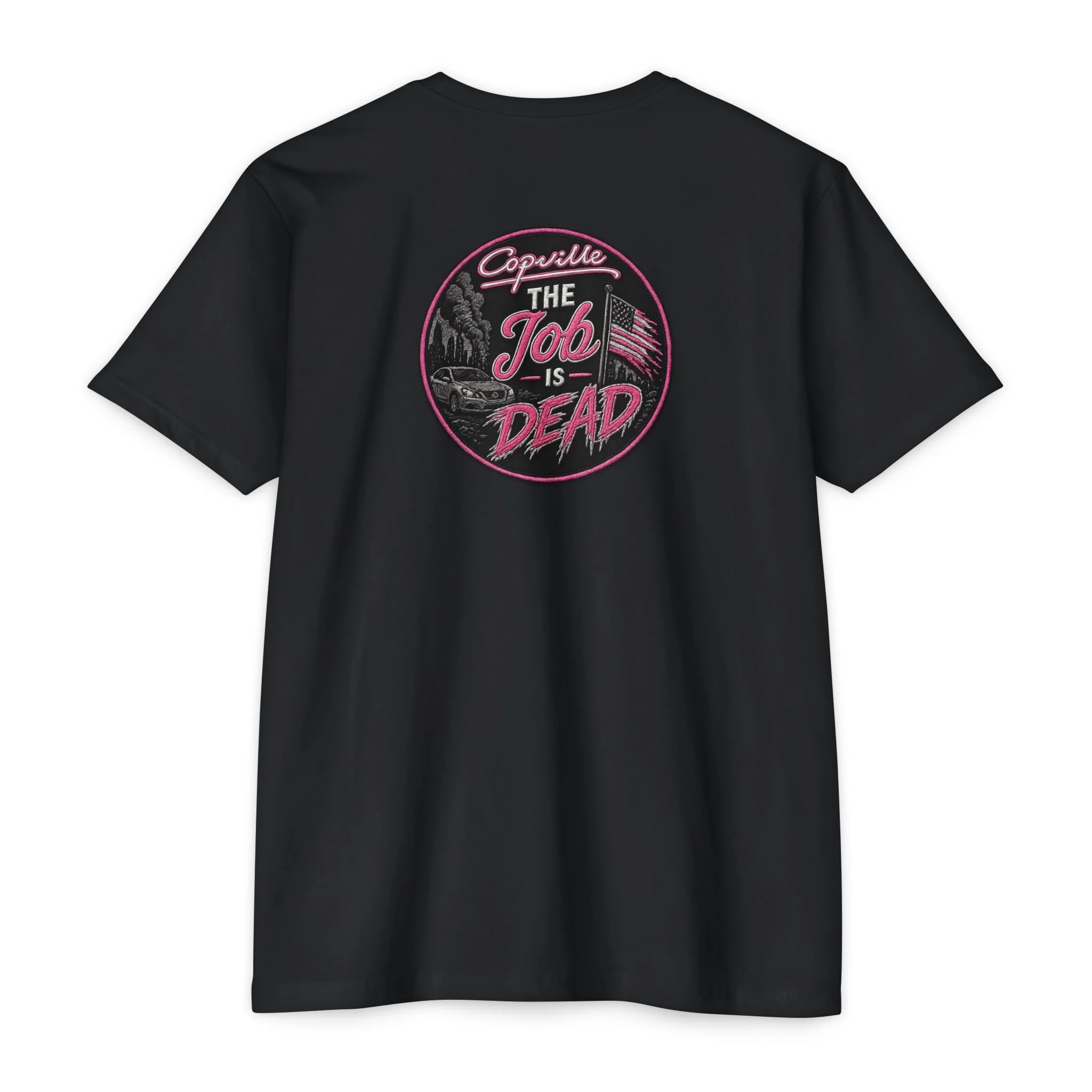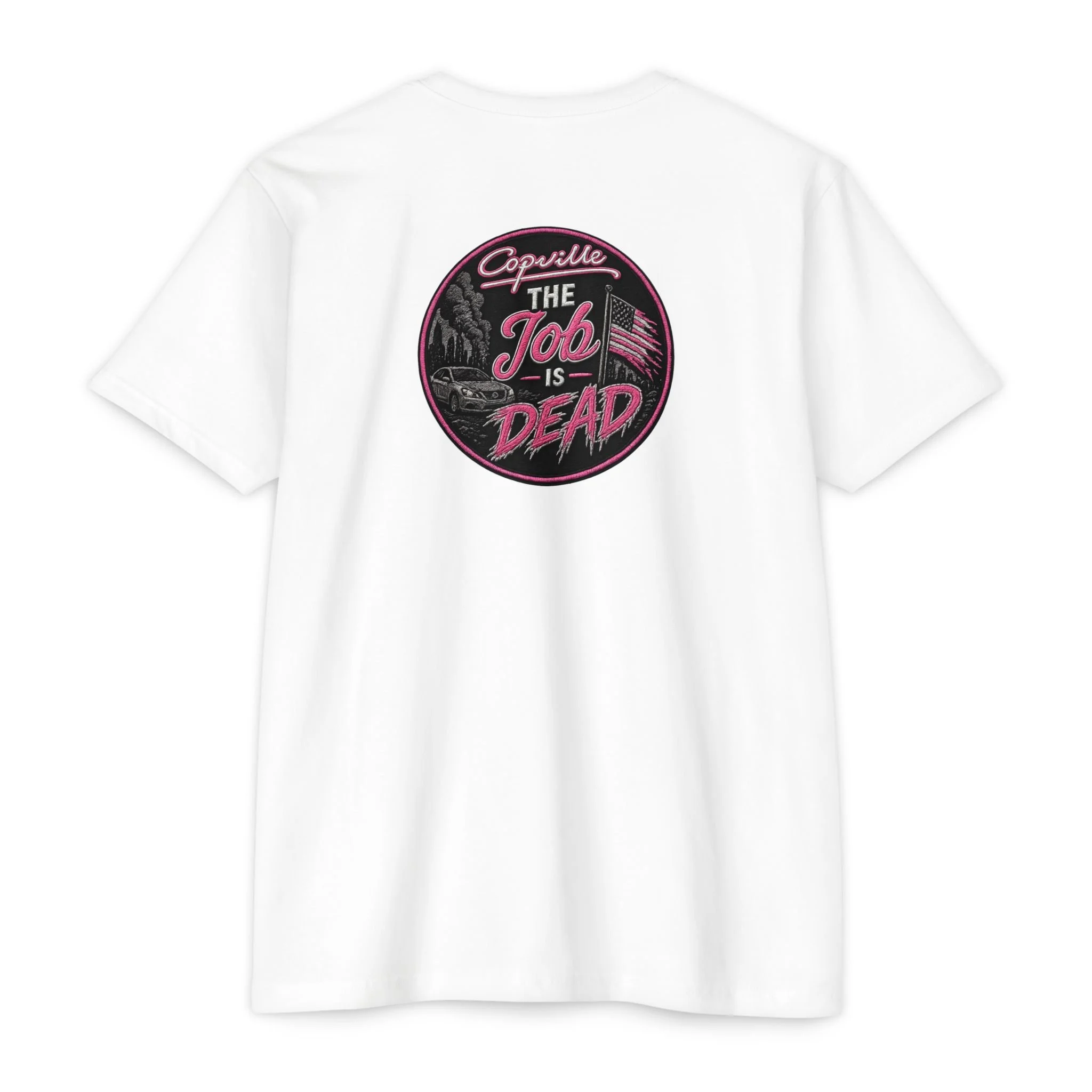 Soft, lightweight tee with a bold, vintage-inspired graphic that speaks to anyone who loves retro style with a modern edge. The front features a small, script logo over the heart while the back shows a circular, hand-drawn patch reading “The Job Is Dead” in moody pinks and deep charcoal tones. Wear it on slow mornings, late-night drives, or over coffee with friends — it feels lived-in from the first wear and carries a quiet, rebellious energy. Subtle distressing in the artwork gives the design a nostalgic, analog print look that pairs effortlessly with jeans, skirts, or layered under a jacket. Breathable and comfortable, it moves with you and keeps the design front-and-center without shouting.