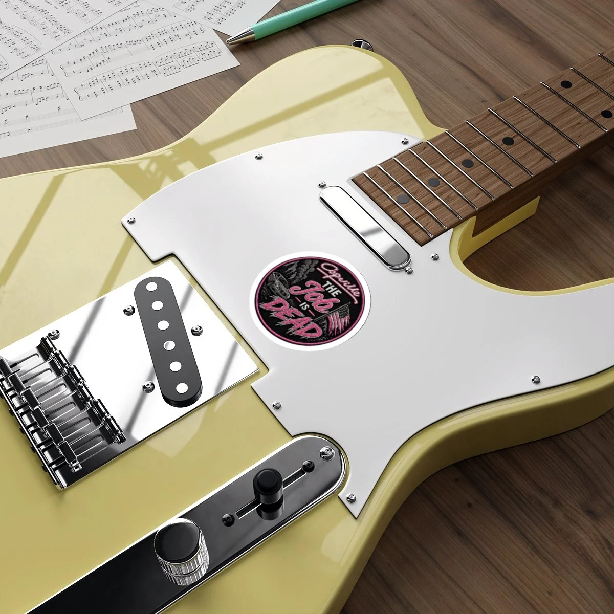 A matte, die-cut vinyl sticker that wears its attitude proudly. Deep black and dusty pink embroidery-style artwork reads “The Job is Dead,” framed by a waving flag and a smokestack scene — a look that feels equal parts rebellious and nostalgic. The sticker’s matte finish and UV protective laminate keep colors muted and durable outdoors, while the water-resistant vinyl and easy-peel backing make application simple on smooth surfaces like laptops, water bottles, or sketchbooks. It carries an eco-conscious edge too, printed with Eco-Solvent inks so it looks good and leaves a smaller footprint.