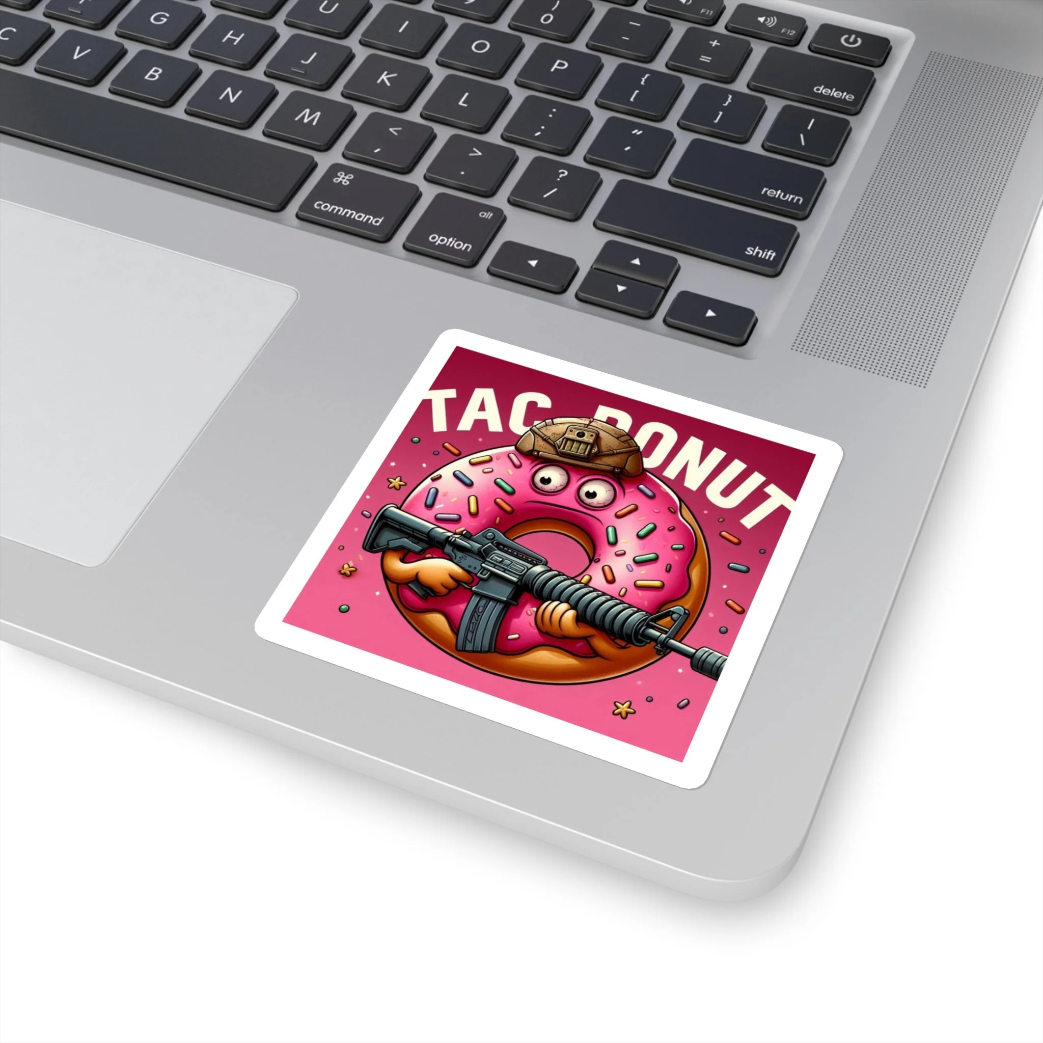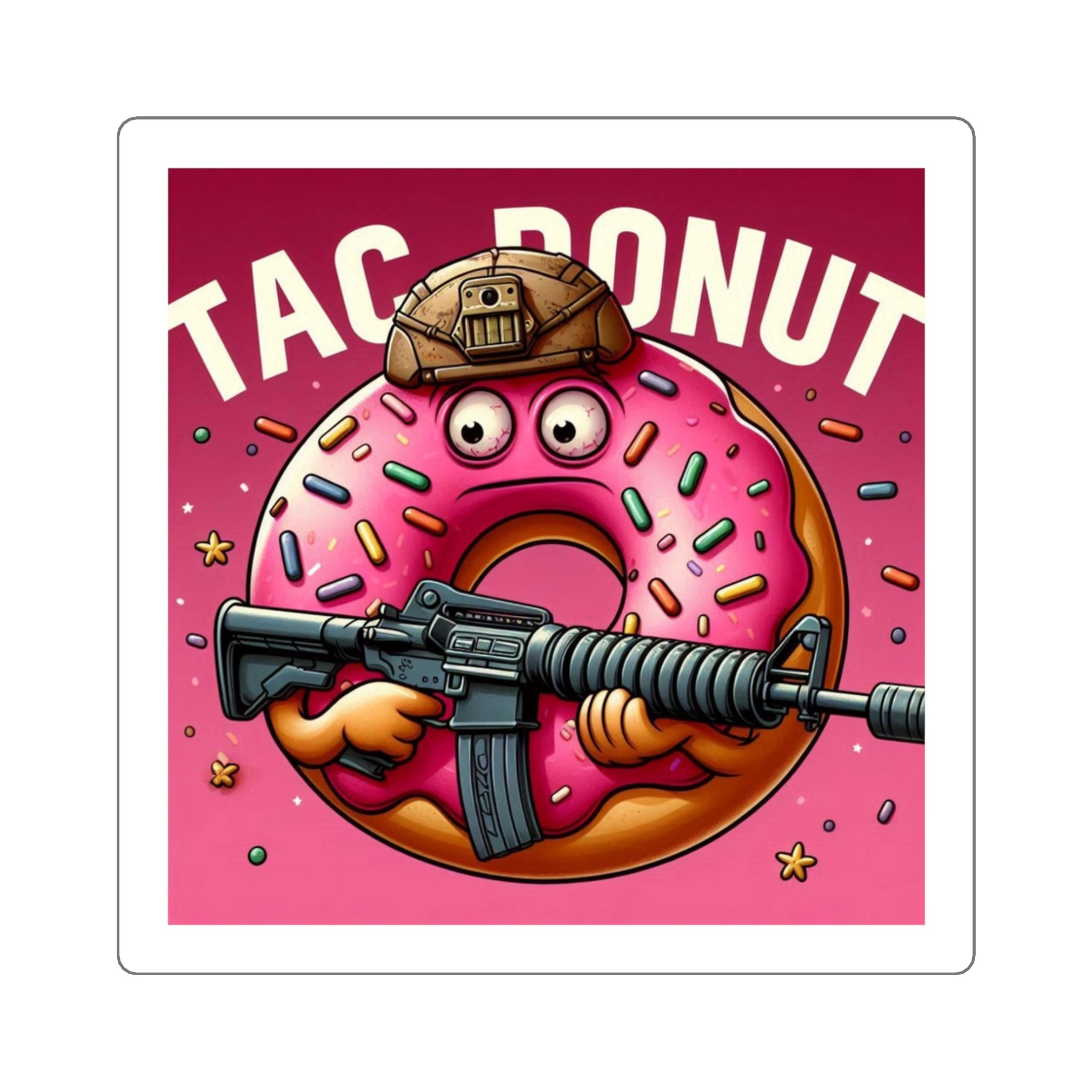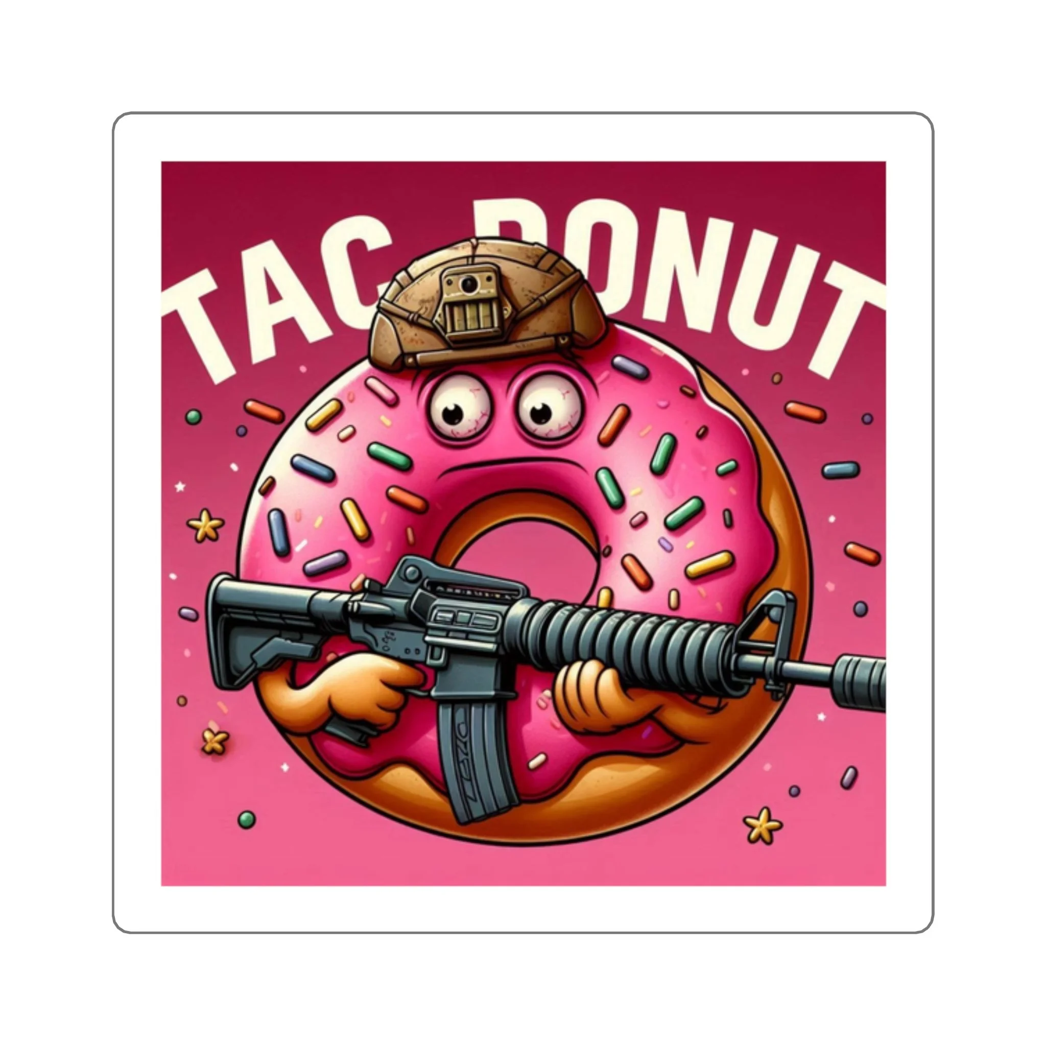 Bright, playful, and a little bit cheeky — these square stickers bring bold color and personality to water bottles, laptops, notebooks, and more. The illustrated pink donut wearing a tactical helmet and holding an assault rifle adds a tongue-in-cheek, irreverent vibe that stands out against the glossy background. Stick one where you want a pop of humor and attitude; the glossy finish highlights vivid inks and gives the design a polished look while the strong acrylic adhesive keeps it in place for indoor use.